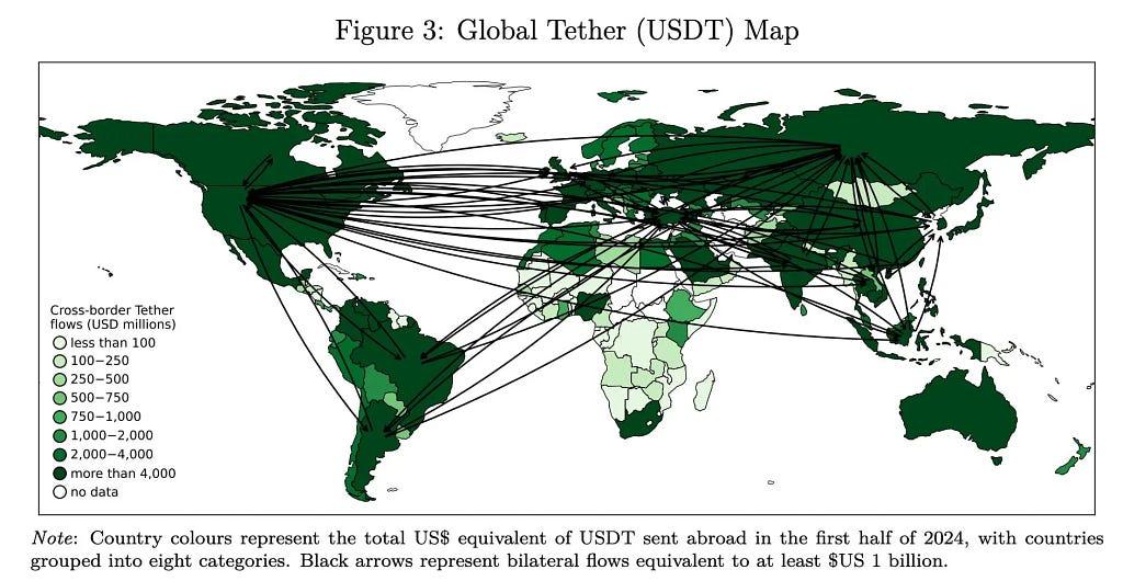 Plasma and Stable may prefer different GTM paths and initial target regions, but both should ultimately anchor where USDT already dominates. The map below shows global USDT flows in H1 2024. Darker country shading means more USDT sent abroad; black arrows mark the biggest corridors. The picture reveals a hub-and-spoke network with especially dense routes across Africa & the Middle East, Asia–Pacific, and Latin America.