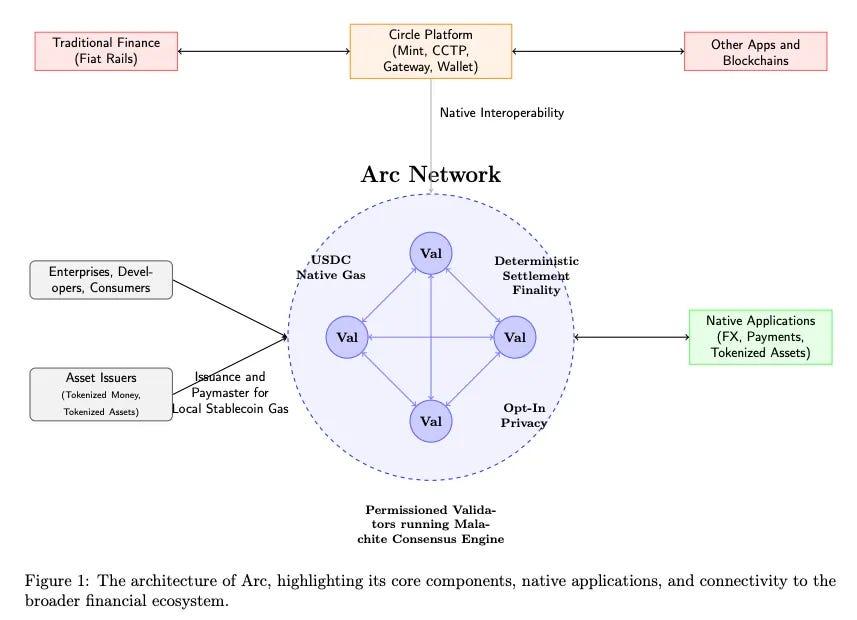 Arc has a permissioned set of validators (running the Malachite BFT engine) provides deterministic finality, fees are paid in USDC as the native gas, and an opt-in privacy layer.