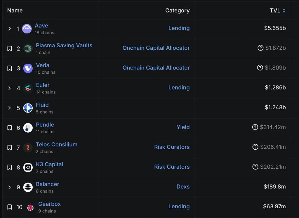Since mainnet beta, momentum has been clear — by September 29 Aave deposits on Plasma topped $6.5B (second-largest Aave market), and by September 30 75k+ users had signed up for Plasma One. As of now, Aave on Plasma sits at $5.7B TVL per DeFiLlama — off the peak yet still #2 (vs. Ethereum $58.7B, Linea $2.3B). Traction spans Veda, Euler, Fluid, and Pendle, aided by day-one onboarding of leading DeFi projects.