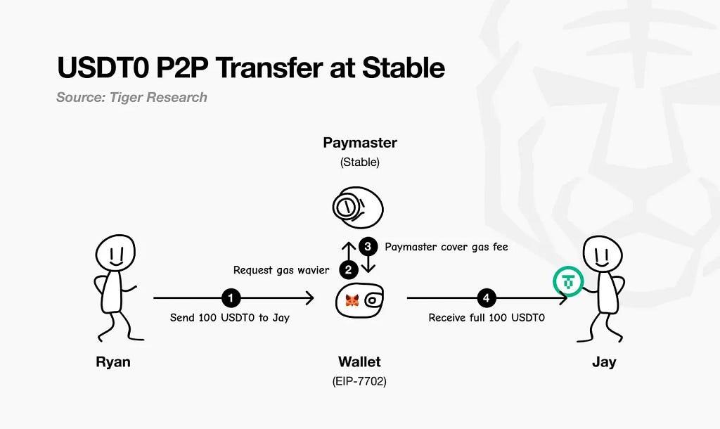 As illustrated in Tiger Research’s flowchart, the sender initiates the payment; the EIP-7702 wallet requests a gas waiver from Stable’s paymaster; the paymaster sponsors and settles the network fee; and the recipient receives the full amount with no deduction. In practice, users only need to hold USDT0.
