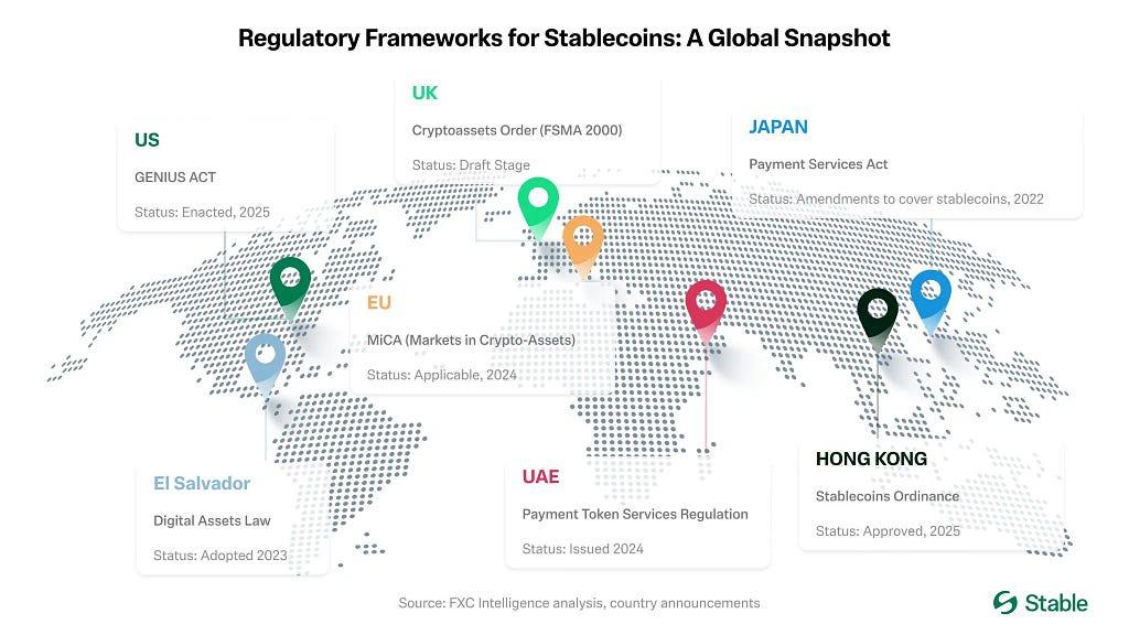 With GENIUS now law — and Hong Kong’s Stablecoin Ordinance setting a parallel regulatory playbook — banks, networks, and fintechs are moving from pilots to production. Banks are launching stablecoins or tight bank–fintech partnerships; card networks are adding stablecoins as a back-end settlement rail ; and fintechs are rolling out compliant stablecoin accounts, cross-border payouts, on-chain checkout with built-in KYC, and tax reporting. Stablecoins are moving from exchange collateral to standard payment plumbing.