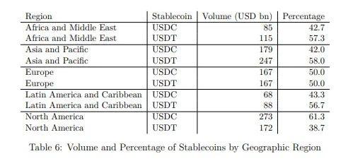 We see a similar pattern in another study: Tether’s USDT appears stronger across regions with more emerging markets while Circle’s USDC is more prevalent in Europe and North America. Note that this study covers only EVM chains (Ethereum, BNB Chain, Optimism, Arbitrum, Base, Linea) and excludes TRON, where USDT usage is very large, so the real-world USDT footprint is likely understated.