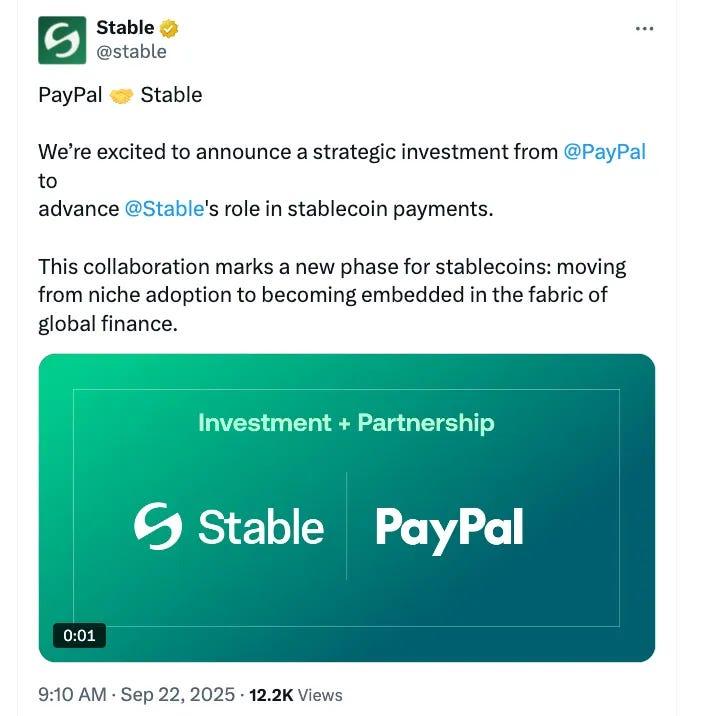 Beyond USDT, Stable sees material opportunities for other stablecoins. With PayPal Ventures invested in Stable in late September 2025. As part of that deal, Stable will support PYUSD (PayPal USD) natively, pushing distribution so PayPal users can “just use PYUSD,” with gas payable in PYUSD. PYUSD will be gas-free on Stable — extending the same operational simplicity that appeals to PSPs in USDT rails.