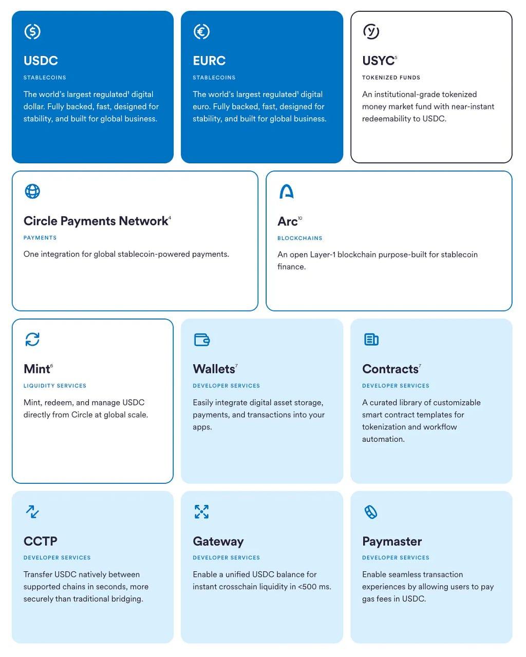 Meanwhile, Circle’s build-out has been deliberate and cumulative: it began with USDC issuance and governance, then pulled control closer by dissolving Centre and launching Programmable Wallets. Next came CCTP, shifting from bridge reliance to native burn-and-mint transfers that unify USDC liquidity across chains. With the Circle Payments Network, Circle connected on-chain value to off-chain commerc. Arc is the latest step. Flanking these pillars are issuer and developer services — Mint, Contracts, Gateway, and Paymaster (USDC-denominated gas) — which reduce third-party dependencies and tighten the feedback loop between product and distribution.