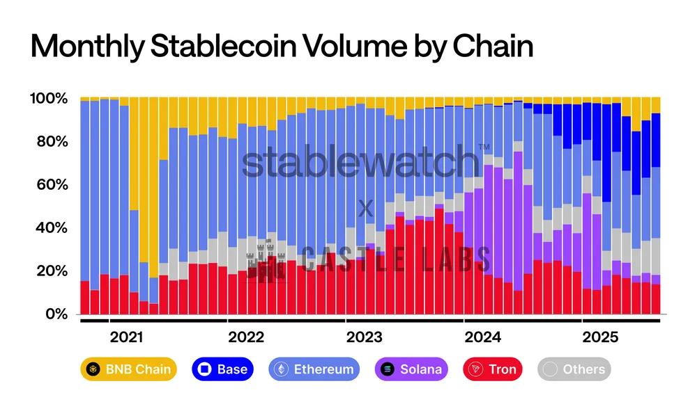 Stablecoin volume is a knife-fight and always has been. The Stablewatch chart shows the arc clearly: early dominance by Ethereum, a powerful rise by Tron, a Solana spike through 2024, and Base gathering momentum more recently. No chain holds a stable lead — even the biggest moats are contested month to month. With specialized, stablecoin-first chains entering, competition should intensify, but incumbents won’t cede share quietly; expect aggressive moves on fees, finality, wallet UX, and off-/on-ramp integrations as they battle to defend — and grow — their stablecoin volume.