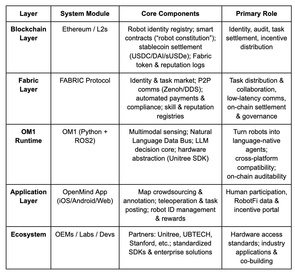 Progress & Assessment. OpenMind is in an early “technically working, commercially unproven” phase. OM1 Runtime is open-sourced on GitHub with multimodal inputs and an NL data bus for language-to-action parsing — original but experimental. Fabric and on-chain settlement are interface-level designs so far. Ecosystem ties include Unitree, UBTECH, TurtleBot, and universities (Stanford, Oxford, Seoul Robotics) for education/research; no industrial rollouts yet. The App is in beta; incentives/tasks are early.