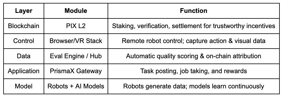Progress & Assessment. Testnet live since Aug 2025 (gateway.prismax.ai). Users can teleop arms for grasping tasks and generate training data. Eval Engine running internally. Clear positioning and high technical completeness; strong candidate for a decentralized labor & data protocol for the embodied era, but near-term scale remains a challenge.