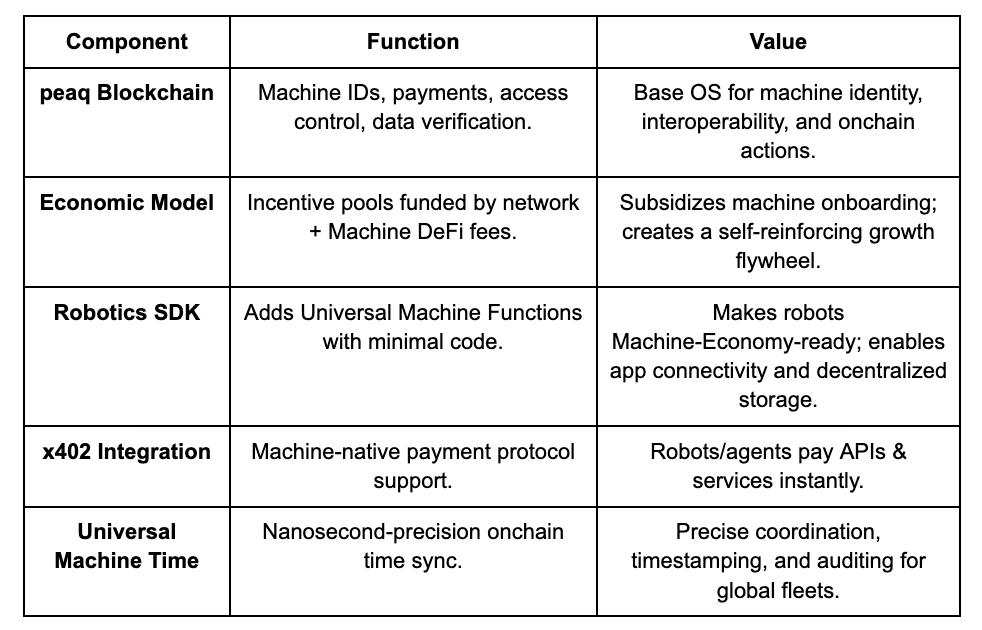 peaq is a Layer-1 chain built for the Machine Economy, providing machine identities, wallets, access control, and time-sync (Universal Machine Time) for millions of robots and devices. Its Robotics SDK lets builders make robots “Machine Economy–ready” with only a few lines of code, enabling vendor-neutral interoperability and peer-to-peer interaction.