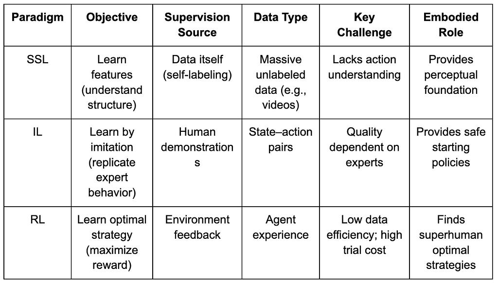 In Embodied AI, these paradigms form a layered learning system: SSL provides representational grounding, IL provides human priors, and RL drives policy optimization,