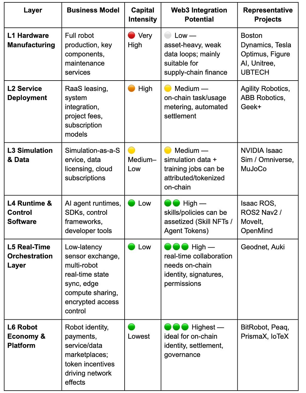 - Hardware manufacturing & service layer: Capital-intensive with weak data flywheels; Web3 can currently play only a supporting role in edge cases such as supply-chain finance or equipment leasing.