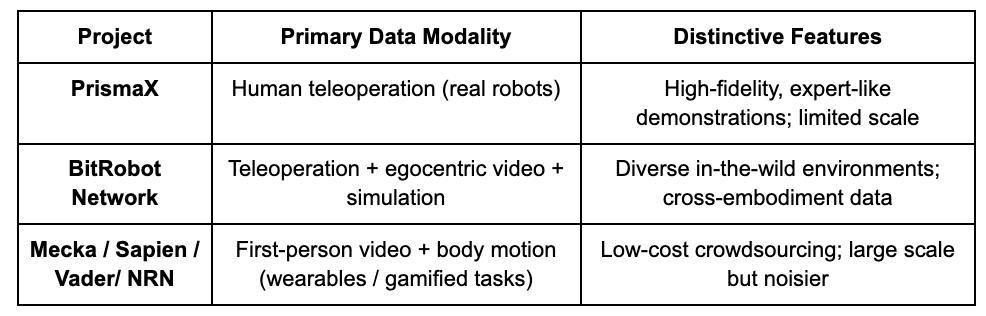 Purpose: unlock scarce, costly real-world data for embodied training via teleoperation (PrismaX, BitRobot Network), first-person & motion capture (Mecka, BitRobot Network, Sapien、Vader、NRN), and simulation/synthetic pipelines (BitRobot Network) to build scalable, generalizable training corpora.