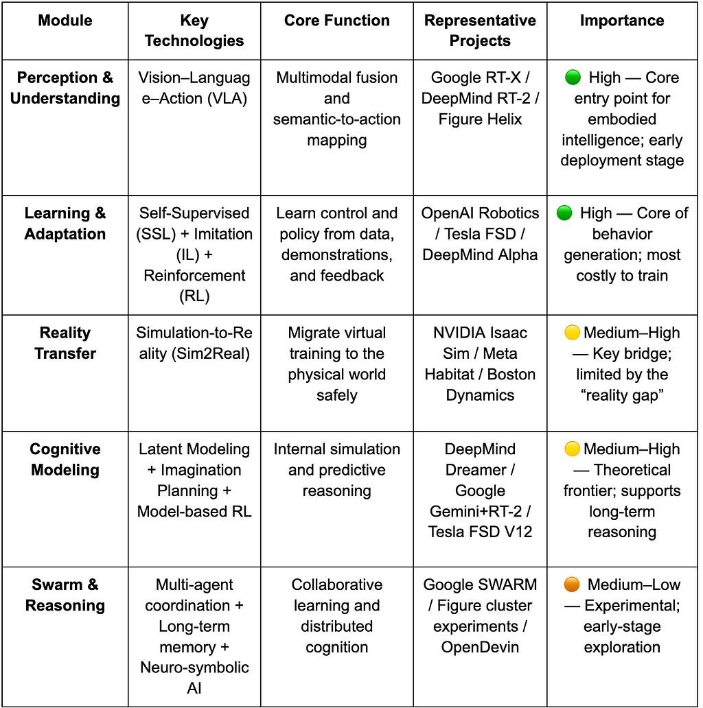 VLA (Perception Fusion), RL/IL/SSL (Learning), Sim2Real (Reality Transfer), World Model (Cognitive Modeling), and Swarm & Reasoning (Collective Intelligence and Memory).