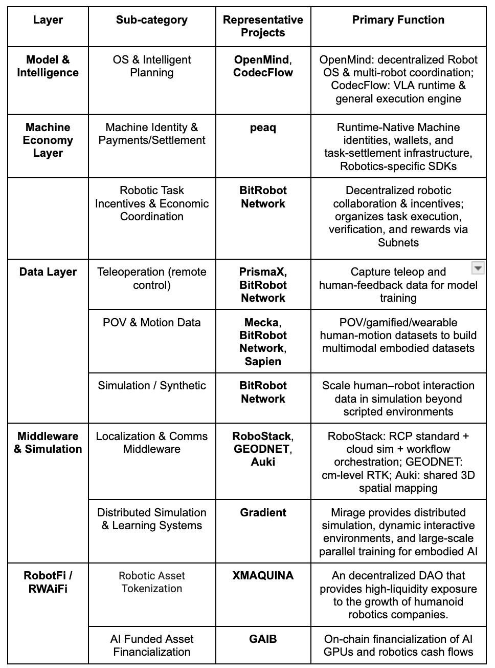 Based on three criteria — verifiable progress, technical openness, and industrial relevance — this section maps representative projects at the intersection of Web3 × Robotics, organized into five layers: Model & Intelligence, Machine Economy, Data Collection, Perception & Simulation Infrastructure, and Robot Asset & Yield (RobotFi / RWAiFi). To remain objective, we have removed obvious hype-driven or insufficiently documented projects; please point out any omissions.