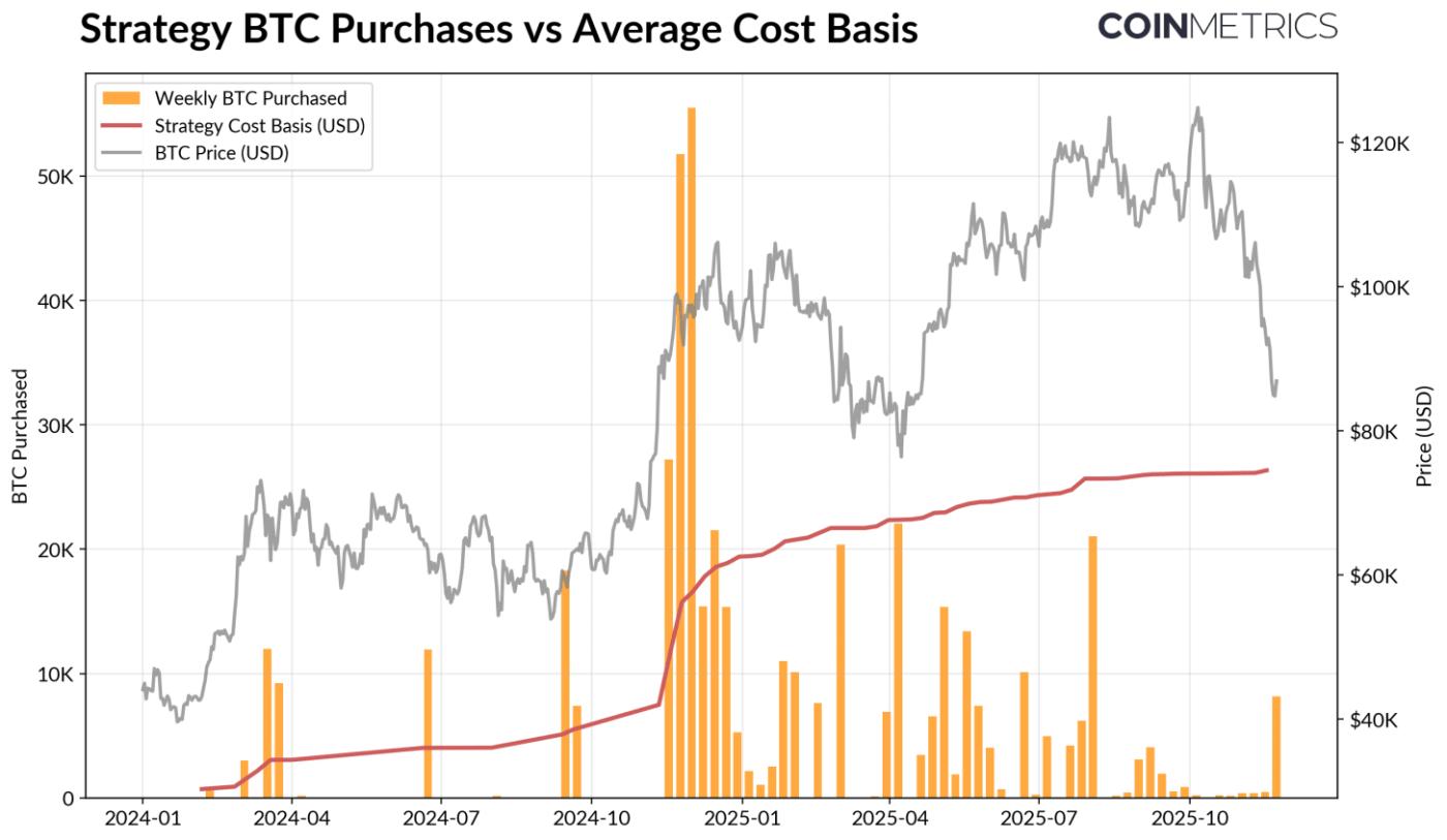 Strategy, the largest DAT currently owns 649,870 BTC (~3.2% of Bitcoin’s current supply) at an average cost of $74,333. As seen in the chart below, Strategy’s accumulation accelerated sharply when BTC was rising and its equity valuation was strong, and has slowed recently, rather than being a source of active selling. Even so, Strategy still sits on unrealized gains, with its cost basis below the current market price.