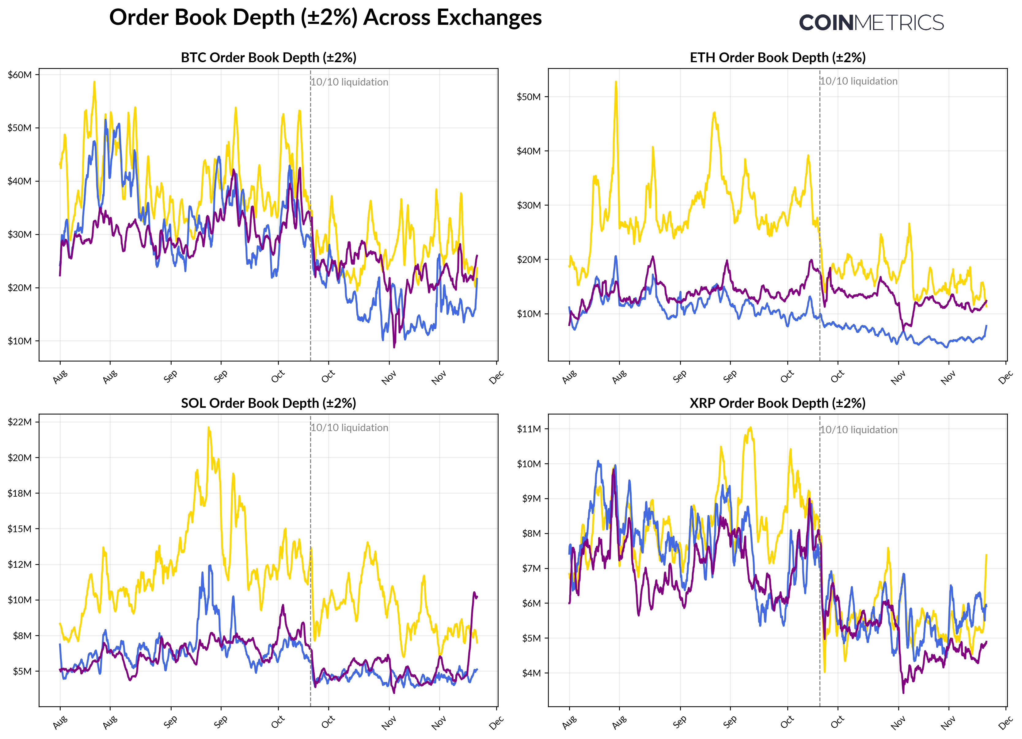Spot market liquidity remains thin following the October 10th liquidation cascade. Across major exchanges, top-of-book depth (±2%) for BTC, ETH, and SOL is still 30–40% below early-October levels, showing that liquidity has yet to recover alongside prices. With fewer resting bids and asks, markets remain more fragile, small bursts of activity can move price disproportionately, increasing volatility and amplifying the impact of forced selling.