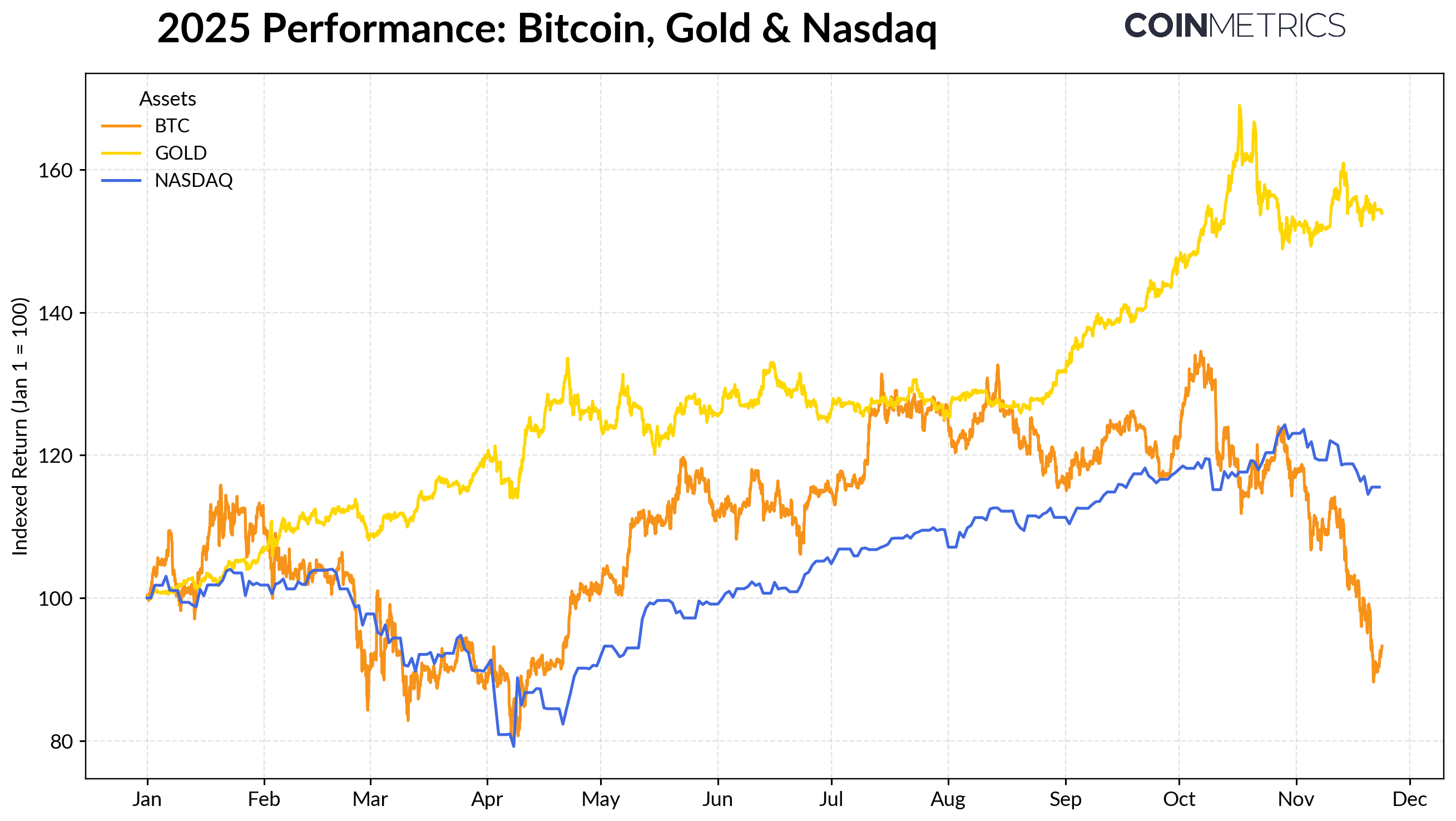 The performance of Bitcoin has increasingly diverged from major asset classes. Gold has powered ahead with year-to-date returns exceeding +50% amid record central bank buying and ongoing trade tensions, while technology equities (NASDAQ) lost momentum in Q4 as markets reassessed the probability of upcoming Fed rate cuts and the sustainability of AI-driven valuations.