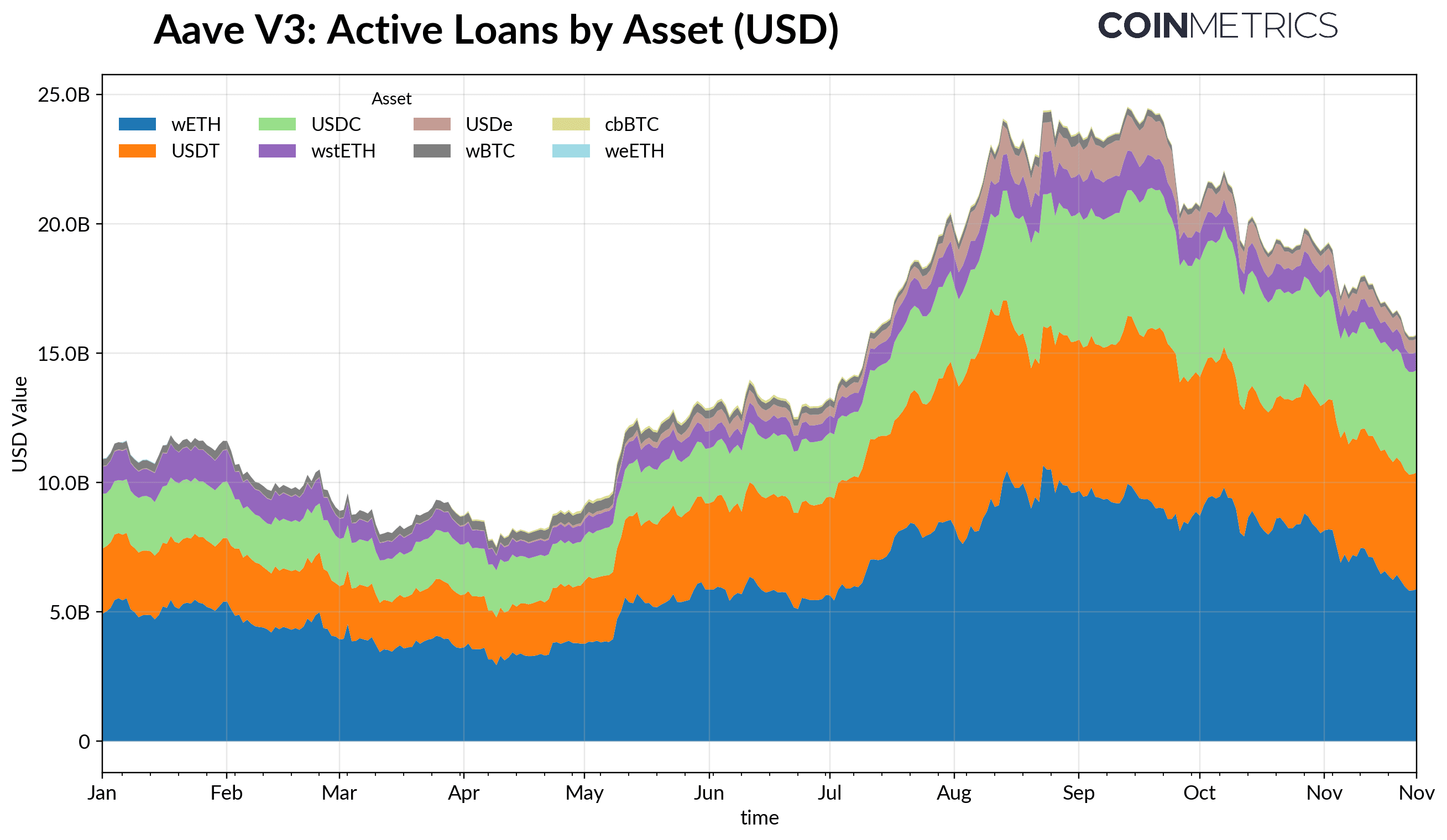 ETH-based borrowing also contracted, with WETH and liquid staking token (LST) loans falling around 35–40%, pointing to reduced looping and the scaling back of yield-bearing collateral strategies.