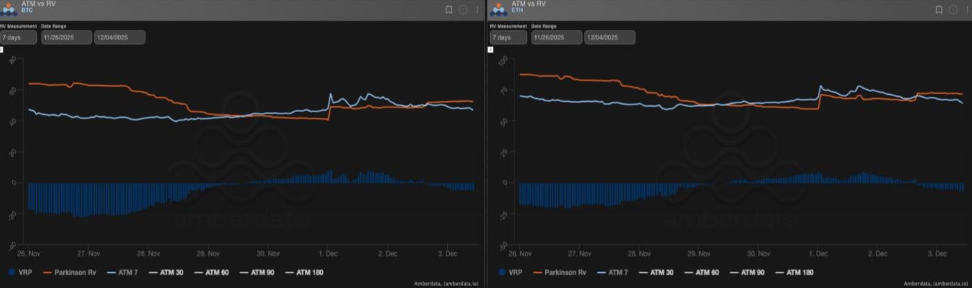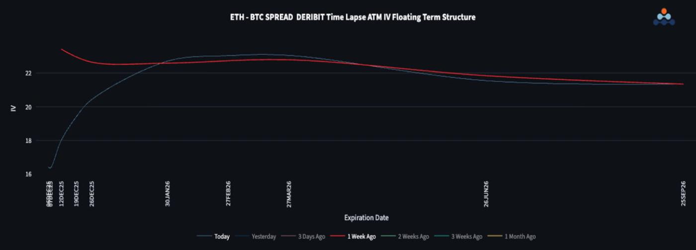 ETH vol compressed sharply versus BTC in the front expiry, bringing the vol spread into the mid- teens (while longer maturities still trade above 20 vols).