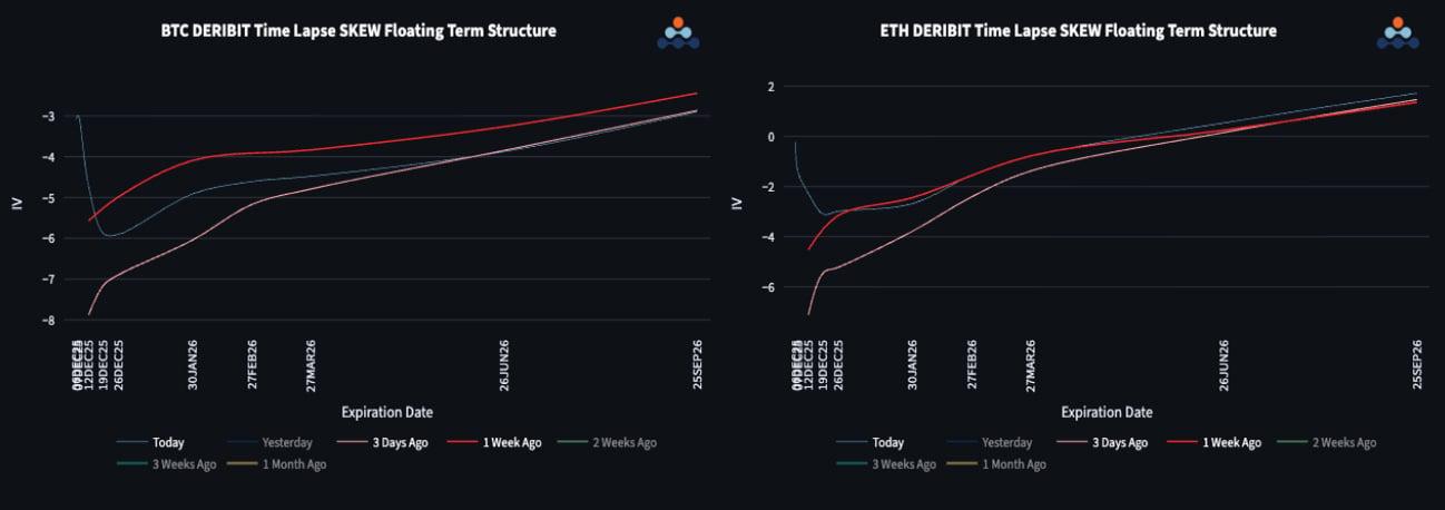 Long-end BTC put skew continues grinding higher on hedging flows. ETH’s front-end skew flipped back to neutral after the latest uptick – often a leading signal for upside acceleration.