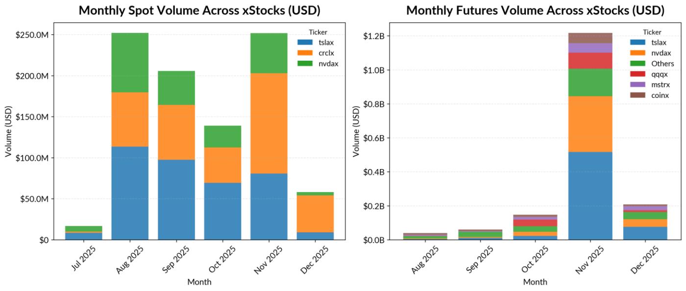 Exchange activity shows early liquidity formation. Spot and futures volumes remain modest and are concentrated in a small set of popular tickers such as TSLAx, NVDAX, and CRCLX, indicating that participation is still dominated by retail and speculative activity. November recorded more than $1.2B in futures volume as investors positioned around Q3 earnings for Nvidia and Tesla, coinciding with a spike in the VIX volatility index.