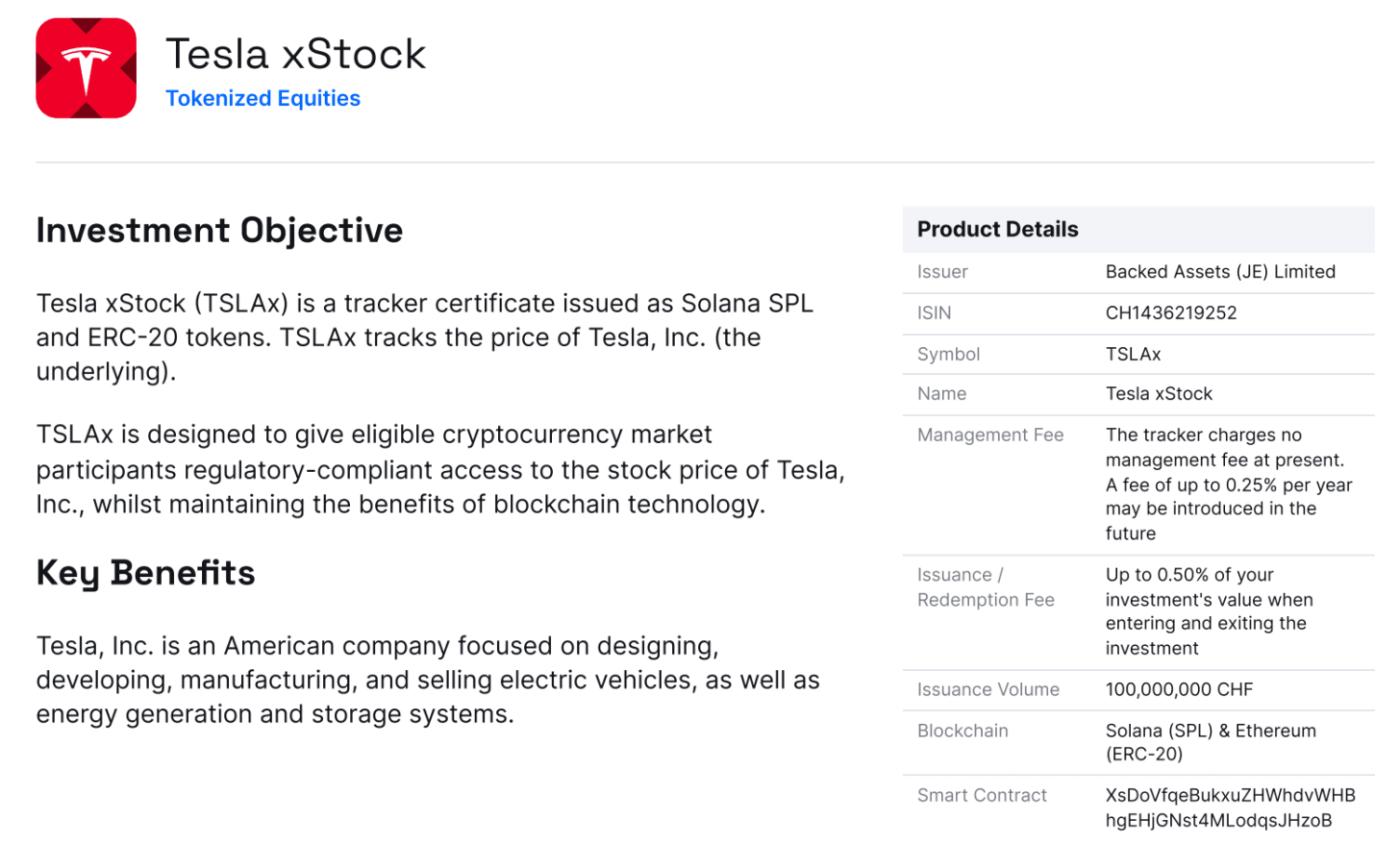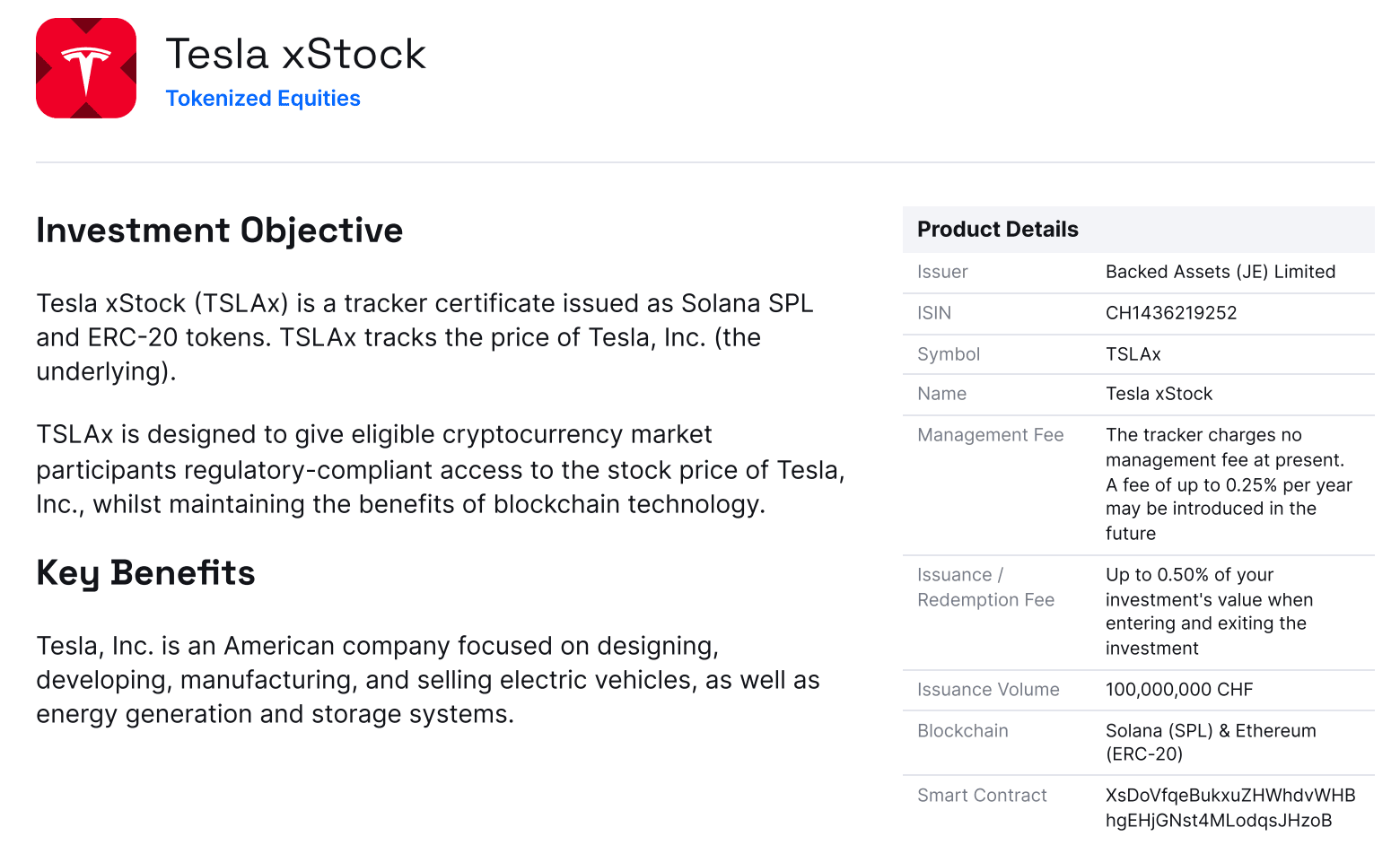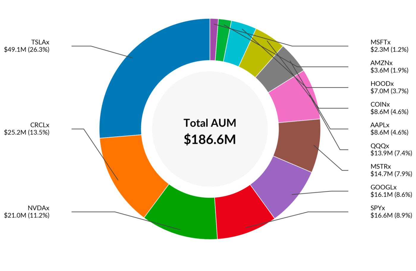For example, this TSLAx factsheet provides information behind how shares of Tesla (TSLA) are tokenized. Tesla currently commands the highest AUM ($49M), backed by current supply of 107K tokens. Corporate actions such as dividends and stock splits are reflected through rebasing supply adjustments, allowing the tokens to continue tracking the underlying asset.