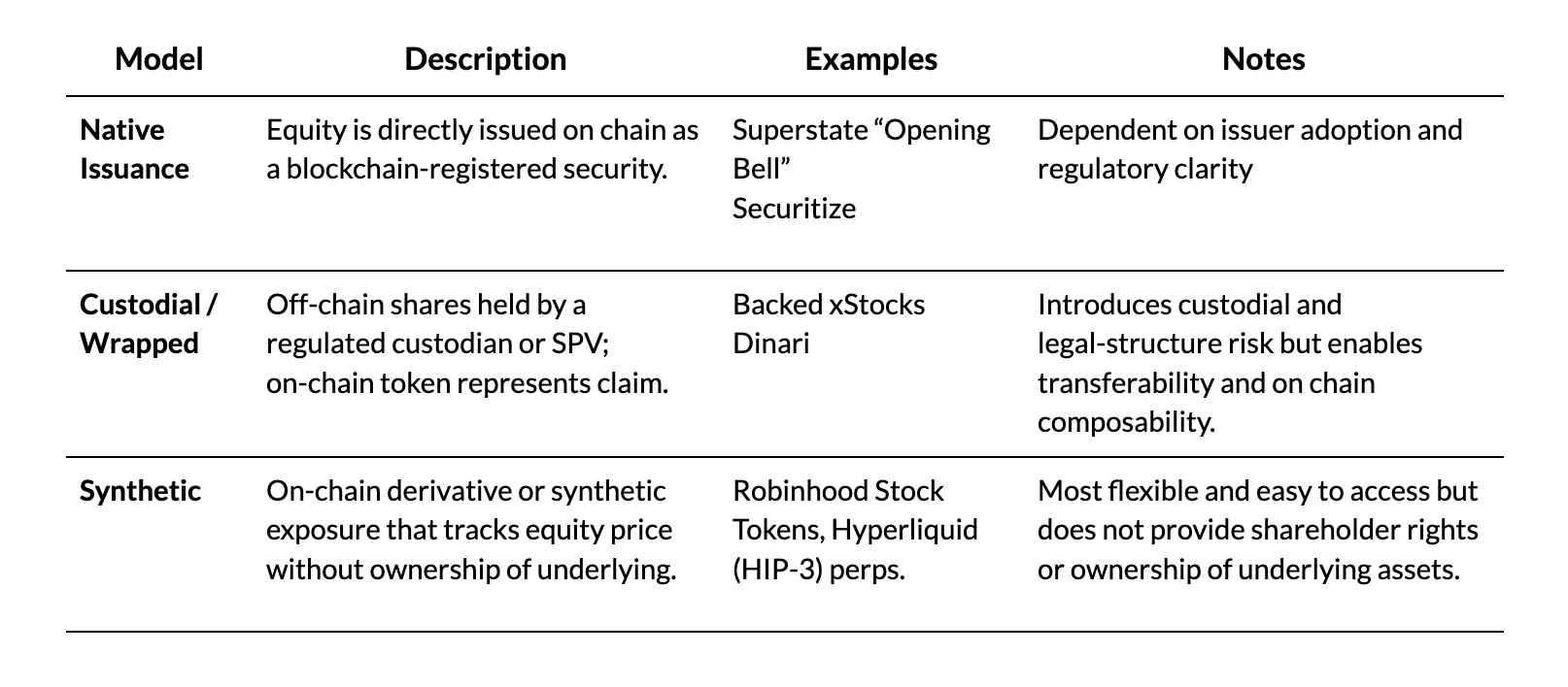 Multiple models are emerging across the equities tokenization spectrum, from native issuance and custodial structures, to synthetic or derivative-based exposure.
