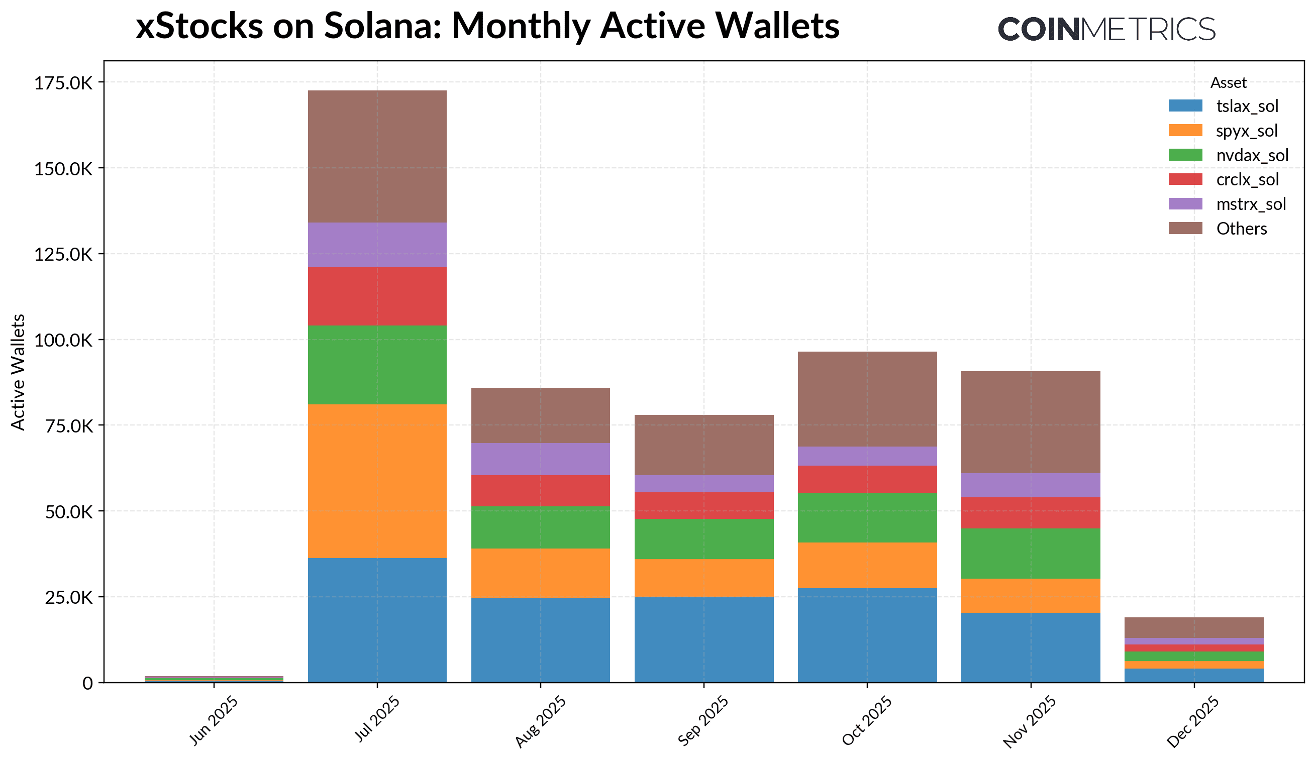 On chain, monthly active wallets interacting with xStock SPL rose meaningfully after launch, reaching roughly 175K wallets in July and stabilizing into an 80K–100K range through the fall. TSLA, NVDA, CRCL, and SPY account for about 58% of active wallets, indicating adoption is concentrated around a small set of high-interest tickers. This reflects a shift from initial discovery toward recurring on-chain use as wallets hold, transfer, or deploy these assets within DeFi.
