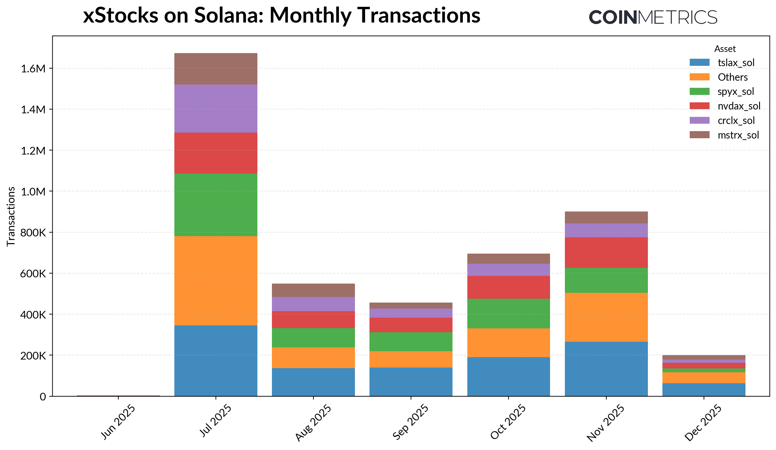 Monthly transactions follow a similar pattern. After an early onboarding spike in July, activity normalized into a 400K–700K range and increased again in November. When scaled by active wallets, this corresponds to roughly 6–10 transactions per wallet per month, suggesting that xStocks are circulating with increasing regularity rather than being passively held.