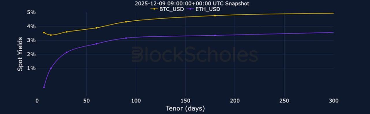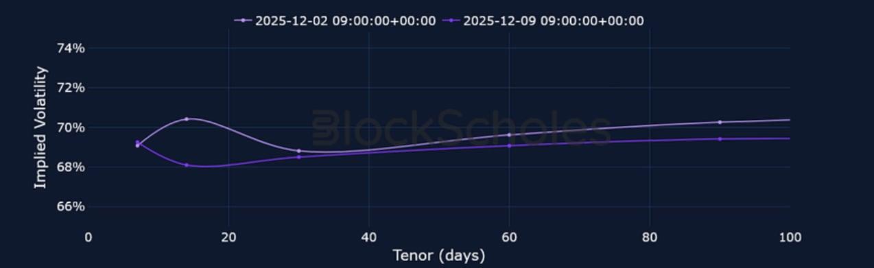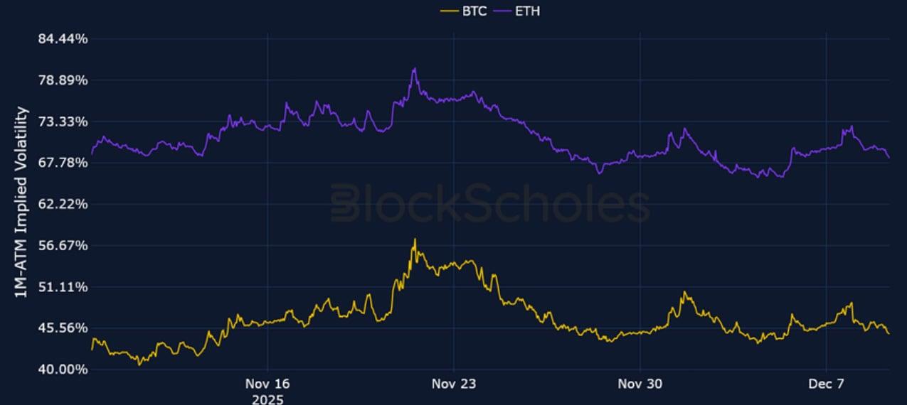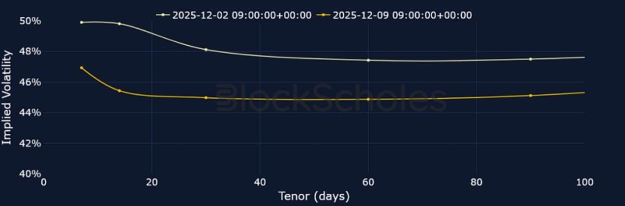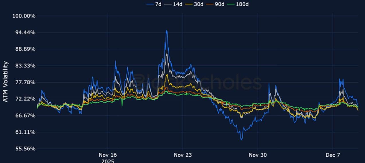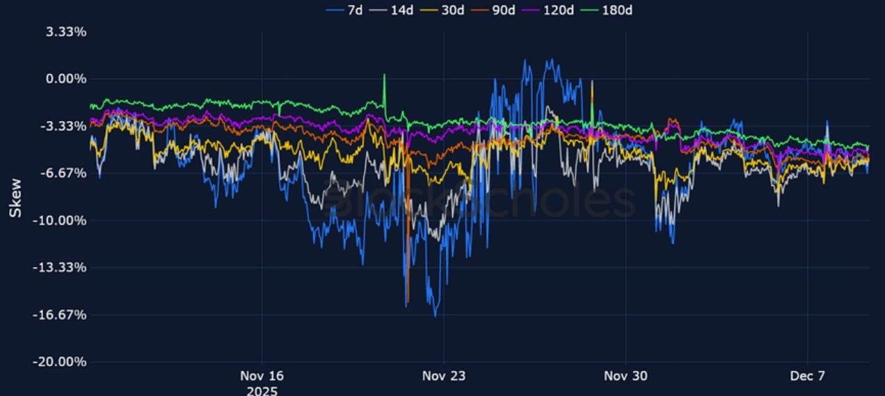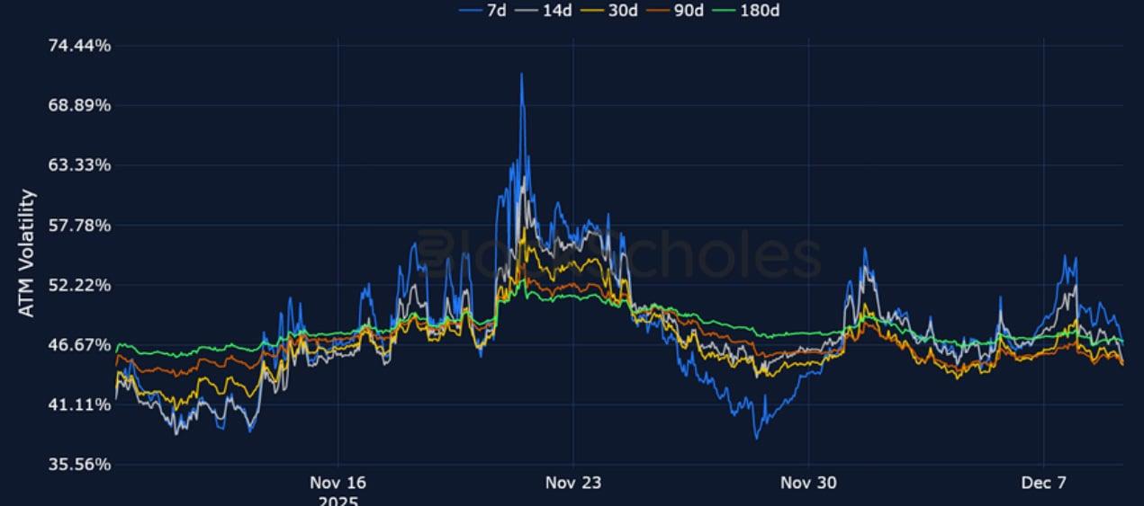 After a modest and short-lived inversion in the term structure of ATM volatility, implied vol levels have dropped off heading into the FOMC’s final meeting of the year. According to Fed Funds futures contracts, markets currently assign a 90% probability of a 25bps cut at that meeting. The drop in forward looking vol expectations is not a phenomenon unique to just BTC and ETH however. The VIX index is close to its year-to-date low, while the MOVE index is equally close to its 2025 low.
