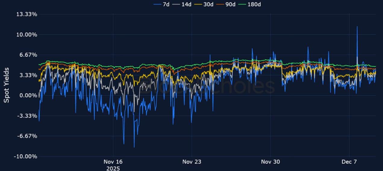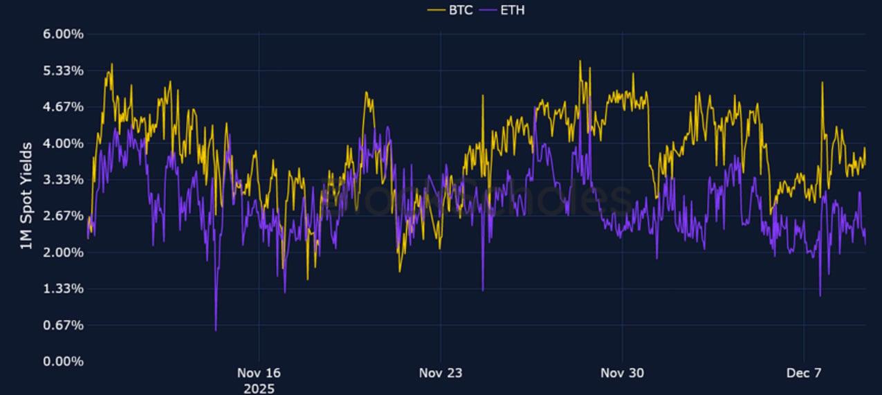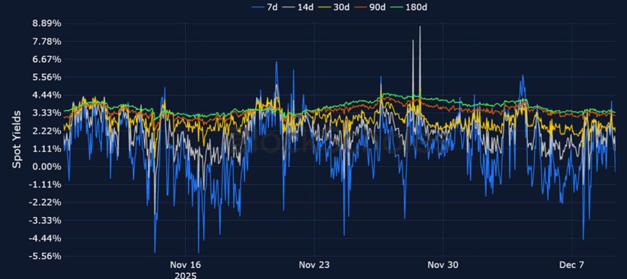 BTC Futures Implied Yields – The extreme bearish positioning of November , which saw futures prices trade below spot, has yet to occur in December.