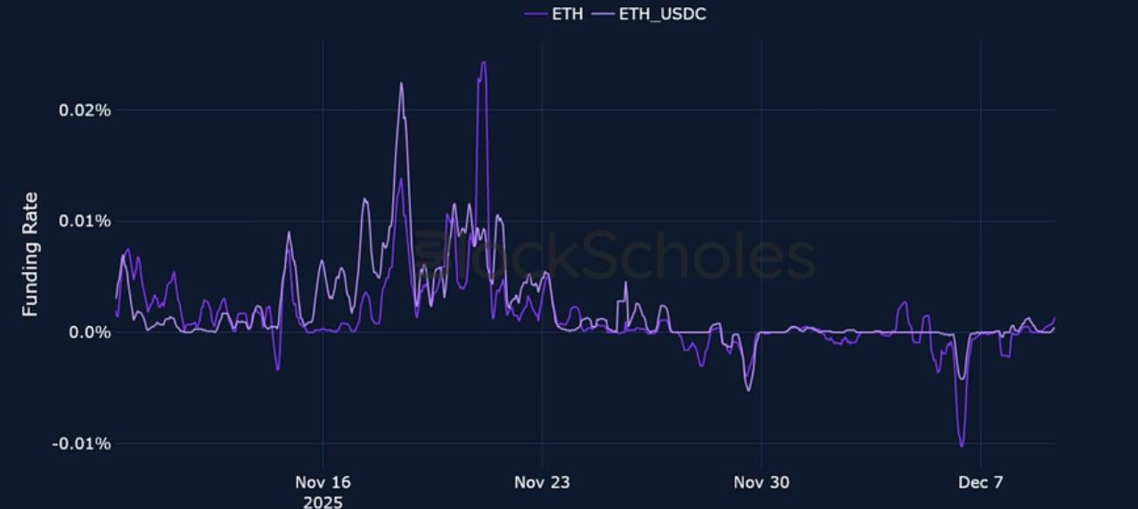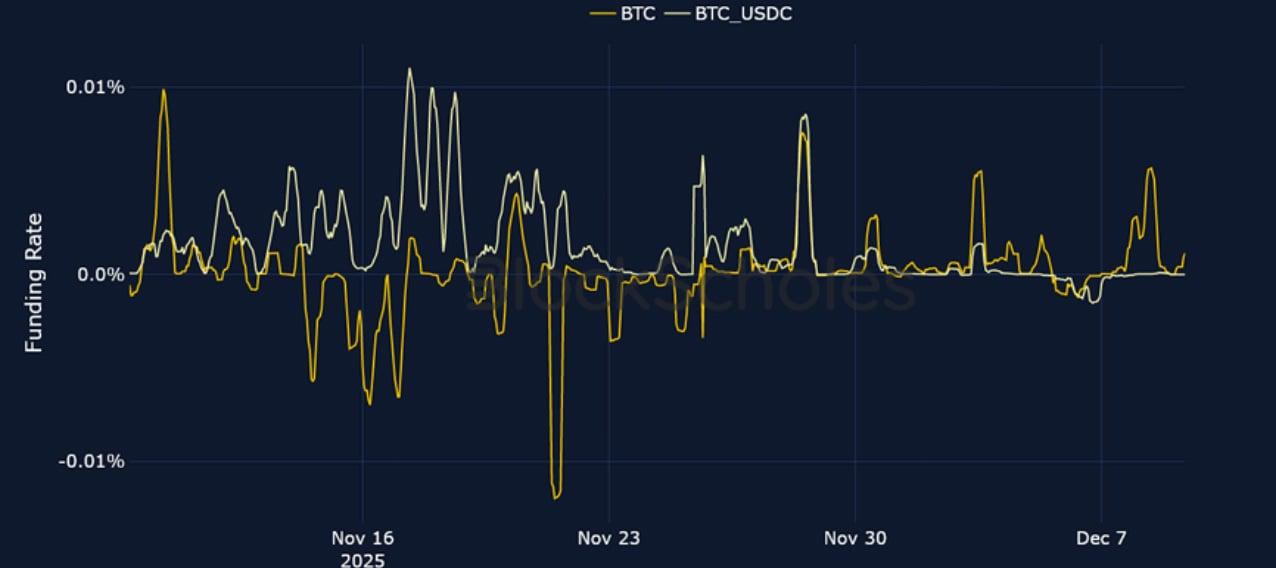 BTC FUNDING RATE – Funding rates saw a modest increase on Dec 8, 2025 coinciding with an intraday high of $92.1K, though quickly fell back down as spot price dropped below $90K.