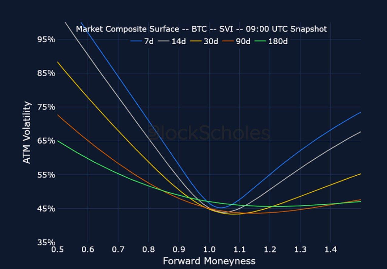BTC SVI ATM IMPLIED VOLATILITY – Short-tenor IV has compressed ahead of the FOMC meeting, following a short-lived inversion earlier this week.