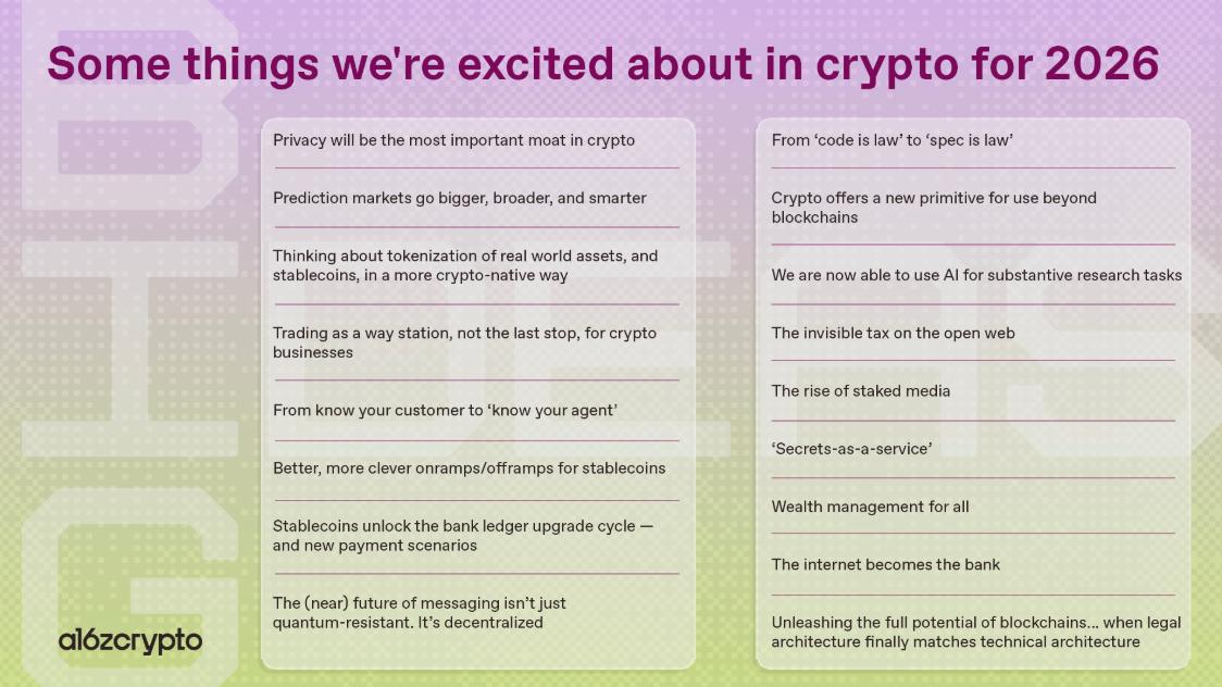 Today, a16z crypto published its annual report, “17 Things We’re Excited About for Crypto in 2026”, offering a systematic analysis of the industry’s trends for the coming year. The report highlights that the infrastructure dividend has largely been realized, and growth in 2026 will increasingly rely on real users, application adoption, and ecosystem collaboration, rather than purely on concepts or market sentiment. This article summarizes the core findings of the report and provides a professional analysis of the key trends shaping the crypto landscape over the next year.