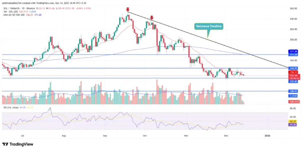 The Solana price is currently trading below the key exponential moving averages (20, 50, 100, and 200), indicating the path of least resistance is downward. If the coin price breaks the $125 support, the selling pressure would accelerate and drive an extended correction of another 20% to hit $1,000 lower.