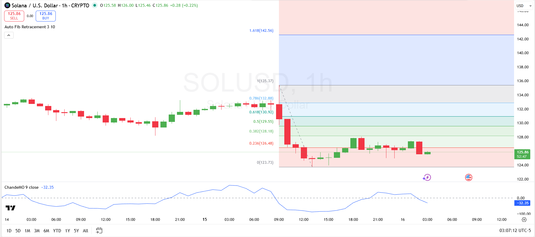 Looking at a TradingView chart, Solana is currently trading below the first Fibonacci retracement level at $126.48 (0.236), which suggests the sellers are still controlling the price. However, a green candle can be seen trying to head towards this resistance.