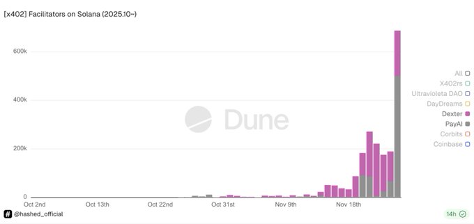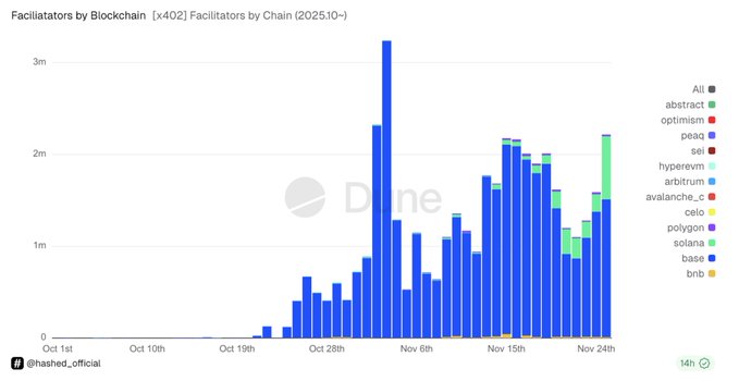 In the x402 payment ecosystem @coinbase has been the leading facilitating blockchain but now @solana is gaining very fast pace momentum In the Solana ecosystem, the majority of it is driven by Dexter but now the transaction number of PayAI suddenly spiked up on Nov 24th making