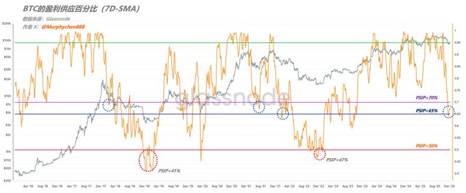 From Nov 22 to Nov 23, BTC’s PSIP (Percent Supply in Profit) once dipped below the critical 65% “boom-bust line”—a pretty dangerous signal. Even after the May 19, 2021 crash, BTC’s PSIP never broke below that threshold during the sharp drop. It wasn’t until April 2022, when PSIP finally fell below the line, that BTC truly entered a deep bear phase. That’s why in our Nov 20 post, we mentioned again the potential for a rebound once market sentiment gets squeezed to extremes. Right now, PSIP has temporarily bounced back to 67.6%, but it’s still stuck in that tight 65%-70% “coin flip” zone. A move up could restore some confidence, but a dip down could easily spark panic. (Figure 1) Here’s another interesting detail to share with you guys: Last time, some sharp-eyed followers noticed that whenever PSIP dropped below 50%, it marked a major bear market bottom (41% in Dec 2018, 47% in Dec 2022). Some of you asked if I could estimate what BTC price would trigger PSIP < 50% in this cycle. As I explained in the quote, this is a dynamic metric—it all depends on how coins change hands as price moves. But if we assume that low-price holders don’t sell, then BTC would need to drop to $59,000 to push PSIP below 50%. But now, that price isn’t $59,000—it’s $62,000! In other words, as coins keep switching hands, if you use PSIP=50% as your bear market bottom range, the future bottom will be at least $62,000 and above. That means any BTC below $62,000 is extremely high value and high conviction (you’ll see plenty of English-speaking analysts pointing this out). For me, this is just a rough expectation range. I’m not betting that we’ll definitely hit it in 2026, but I’ll factor it into my trading plan as a scenario to prepare for. No matter where the market winds blow or what the crowd says, all I’ll do is wait patiently and stick to my strategy. ---------------------------------------------- Sponsored by @Bitget | Bitget VIP: lower fees, bigger perks twitter.com/Murphychen888/stat...